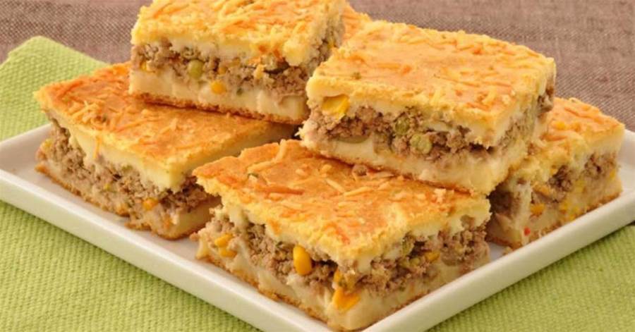 Em uma forma de 25cm x 35cm untada e enfarinhada, despeje metade da massa, espalhe o recheio e cubra com a massa restante.