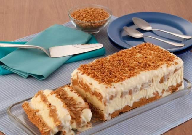 Em uma fôrma de bolo inglês média forrada com filme-plástico, intercale camadas de sorvete e de creme, terminando em creme.