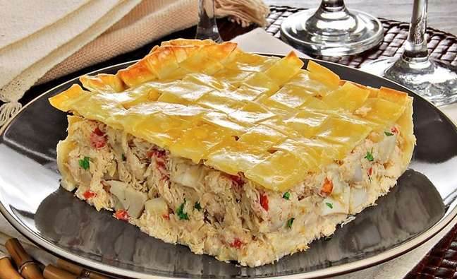 Espalhe o recheio, corte tiras com a massa e trance sobre o recheio.