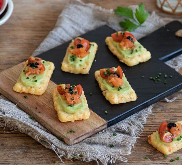 Com a ajuda de uma colher distribui o creme de abacate, o tomate e o salmão pelos canapés.