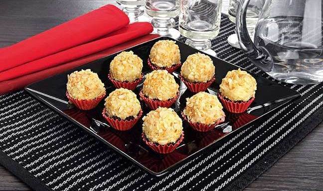 Com as mãos untadas, modele bolinhas, passe pelas amêndoas trituradas, coloque em forminhas e sirva.
