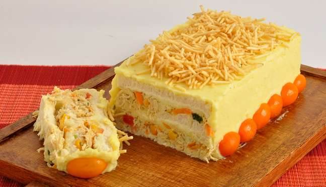 Para a montagem, em uma fôrma de bolo inglês forrada com papel-alumínio, faça uma camada de pão de fôrma, umedeça com um pouco de creme de leite, uma de purê de batata e uma de refogado de frango.