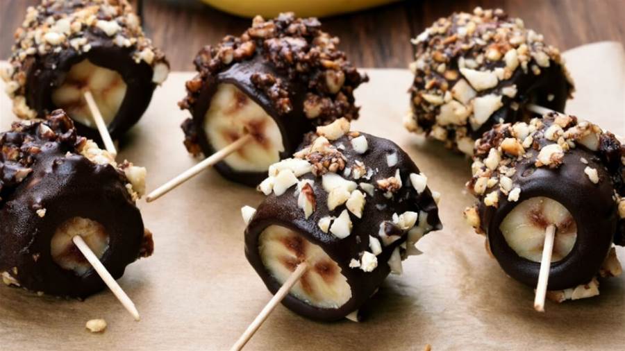 Espete os palitos nas bananas com a casca, coloque no freezer por 30 minutos aproximadamente e retire a casca.