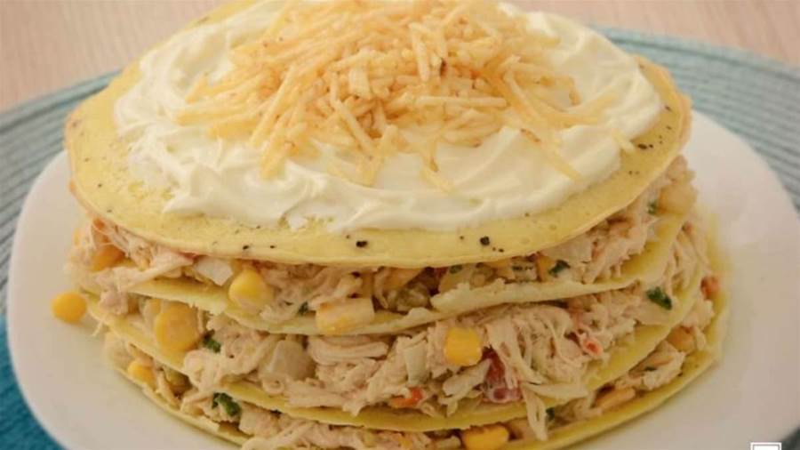Em um prato, faça camadas de omelete e de recheio, terminando em omelete.