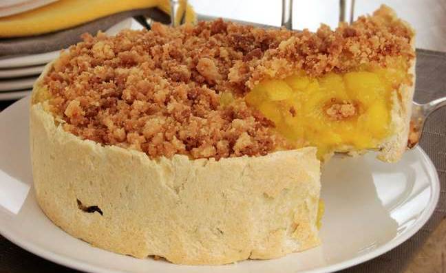 Distribua o recheio sobre a massa e cubra com a farofa reservada.