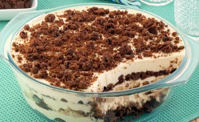 Em um refratário médio, faça uma camada com metade dos cookies restantes, uma camada de creme e uma de bolo.