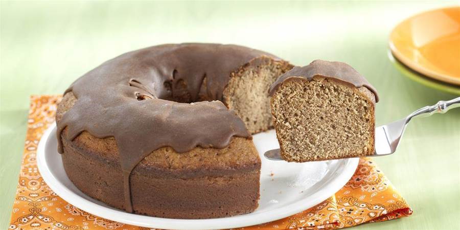 Retire do fogo, mexa a calda vigorosamente com uma colher até esfriar e despeje sobre o bolo ainda quente.
