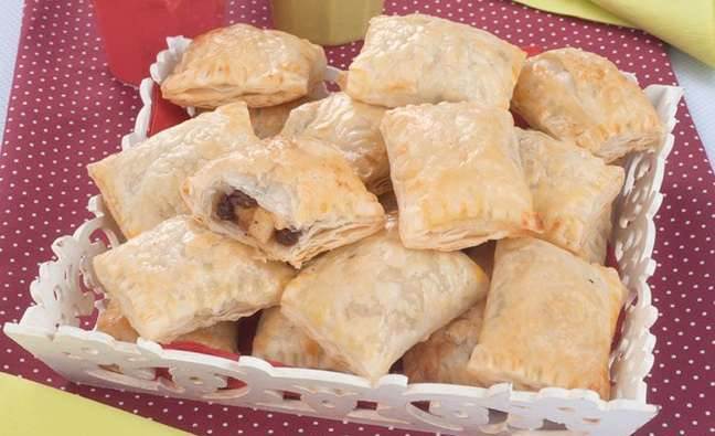 Corte retângulos da massa, coloque porções do recheio e dobre ao meio, apertando as laterais com um garfo.
