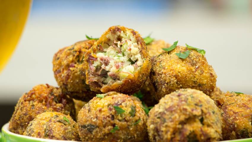 Misture bem a batata com a carne, a salsinha e a cebolinha.