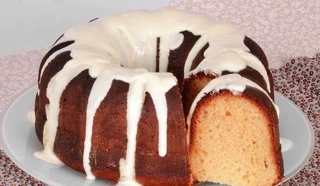 Despeje a massa em uma fôrma de buraco no meio de 24cm de diâmetro decorada, untada e enfarinhada, e leve ao forno médio, preaquecido, por 30 minutos ou até assar e dourar levemente.