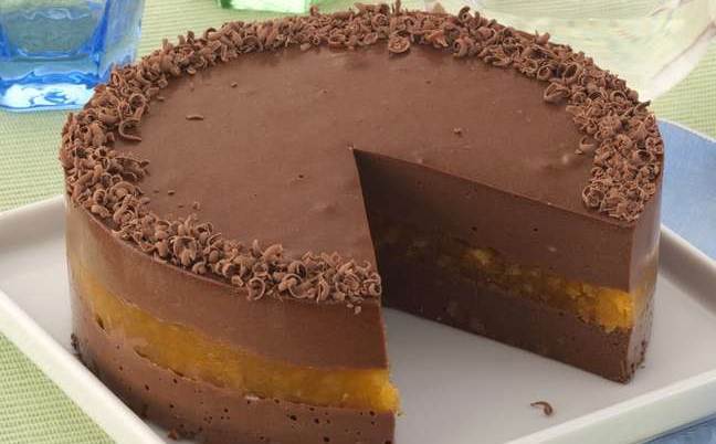 Retire, espalhe a geleia sobre a camada anterior e cubra com o creme de chocolate restante, sempre alisando com uma colher.