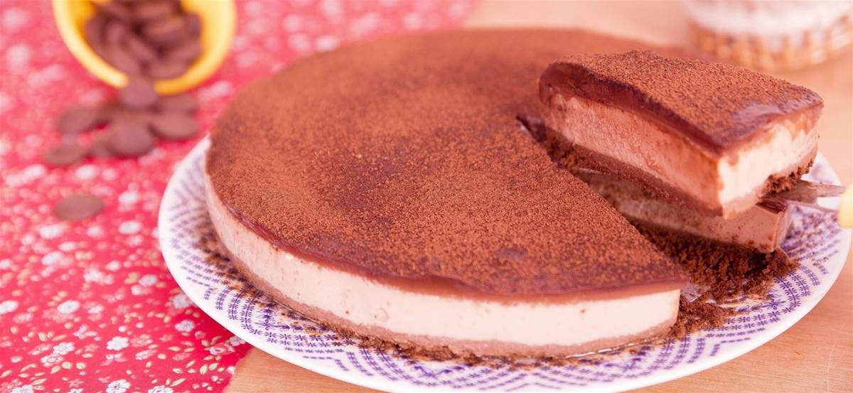 Na hora de servir, decore a torta polvilhando chocolate em pó por cima.
