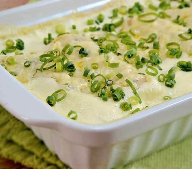 Forre uma travessa com 1/3 do molho de requeijão, ajeite os canelones por cima e cubra com o molho restante.