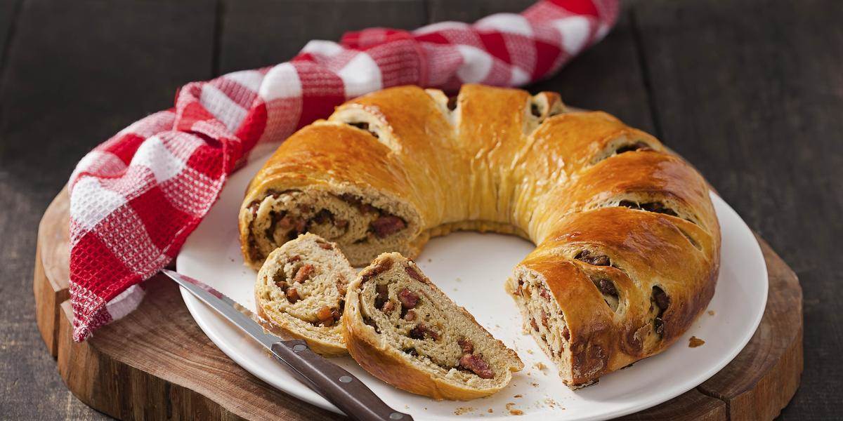 Junte as duas pontas do pão e coloque em uma forma redonda, untada com manteiga e polvilhada com farinha de trigo.