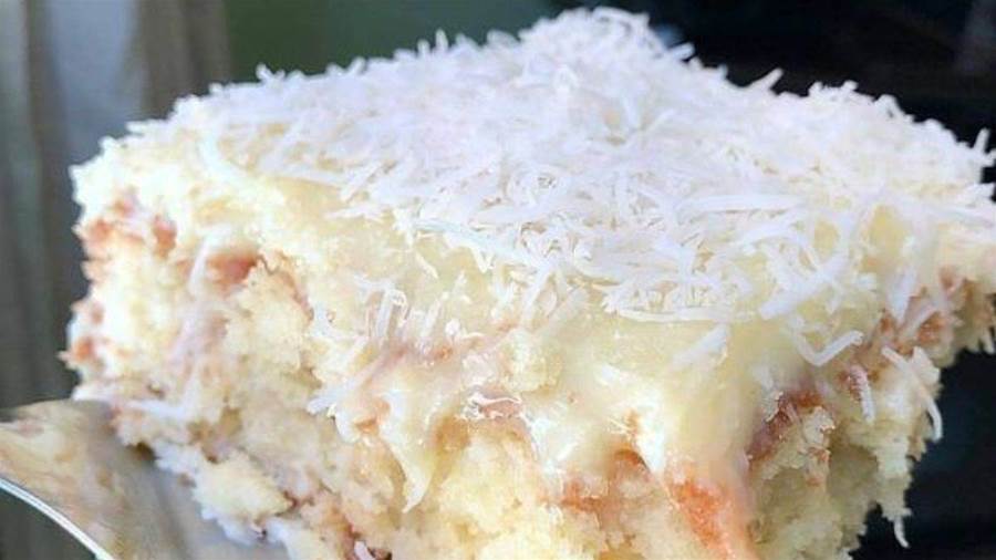Retire o bolo do forno, fure com um garfo e ainda quente na própria forma, cubra-o com o leite condensado e o coco ralado umedecido.