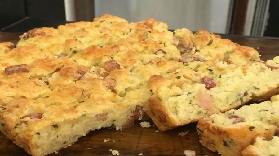Misture a farinha com o fermento, o sal, o bacon e a muçarela.
