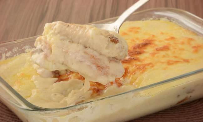 Em um refratário médio, faça camadas de molho e de peixe, terminando em molho.