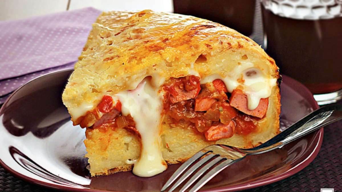 Coloque metade da massa em uma fôrma redonda média untada, espalhe o recheio por cima, faça uma camada com o requeijão e cubra com o restante da massa.