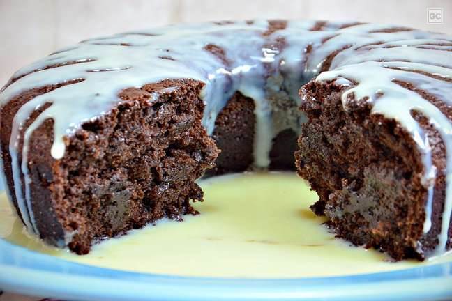 Despeje em uma fôrma de buraco no meio de 22cm de diâmetro untada e polvilhada com chocolate em pó e leve ao forno médio, preaquecido, por 35 minutos ou até firmar.
