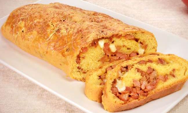 Enrole como rocambole, fechando as laterais, e coloque em uma fôrma untada e enfarinhada.