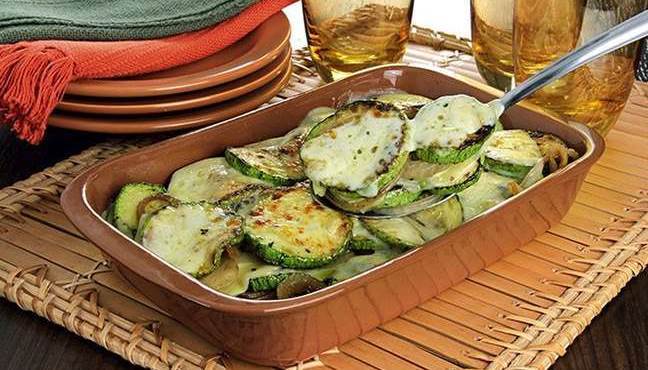 Para a montagem, em um refratário médio untado, faça camadas de abobrinha com cebola e de queijo.