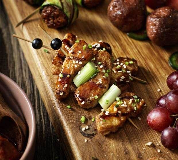 Preparar as espetadas colocando nos palitos cocktail de forma alternada as Tiras Braseadas GARDEN GOURMET e o alho-francês.