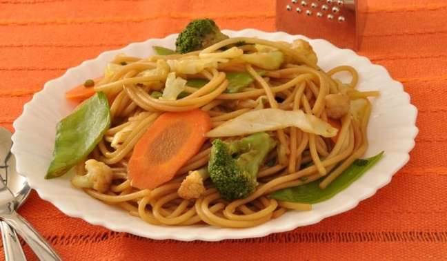 Adicione o macarrão cozido, o óleo de gergelim e a cebolinha.