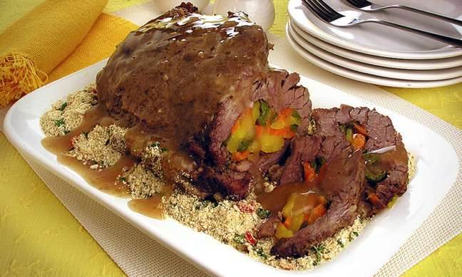 Coloque dentro da carne, recheando, a cenoura, a mandioquinha, o pimentão e a ervilha.