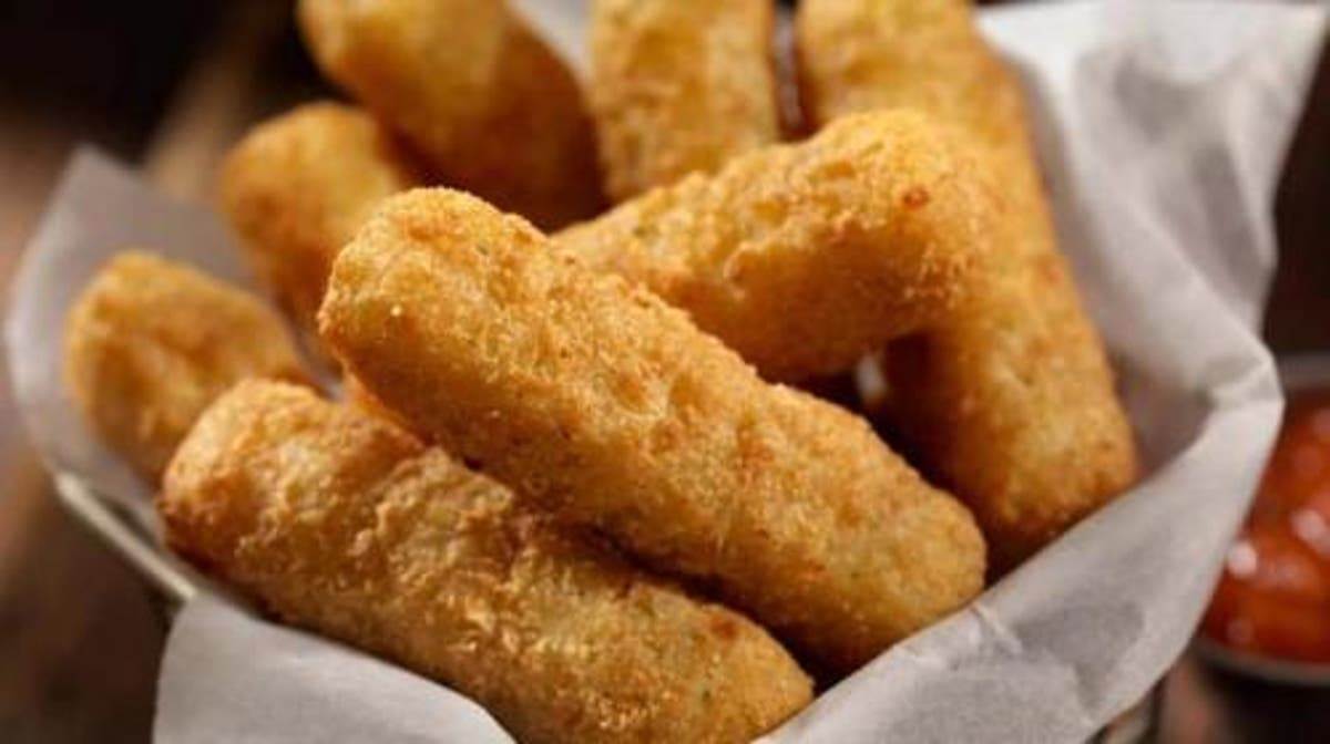 Passe as tiras de muçarela pela farinha de trigo, pelos ovos batidos e pela farofa de pão. Repita o processo mais uma vez antes de fritar.