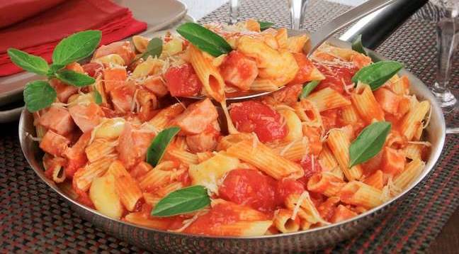 Adicione o extrato, o tomate pelado, a água quente, o tempero em pó, o macarrão e cozinhe, mexendo algumas vezes, até o macarrão ficar al dente.