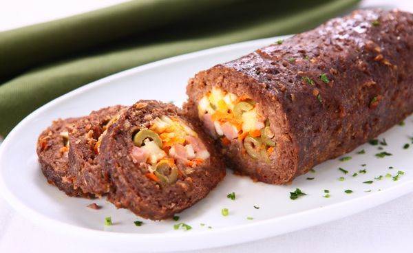 Dispor a carne em uma forma retangular untada, tipo de bolo inglês, formatando as bordas e deixando um espaço para o recheio.