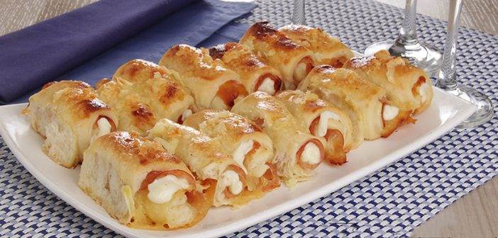 Coloque fatias de peito de peru e de mussarela nos retângulos de massa e enrole.