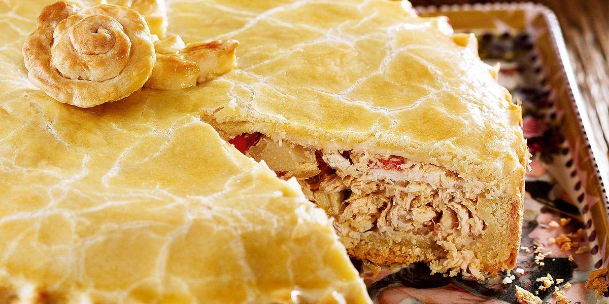 Abra a massa reservada com auxílio de um rolo, cubra a torta, fechando bem as bordas, pincele com a gema e leve ao forno médio (180°C), preaquecido, por cerca de 40 minutos ou até dourar.