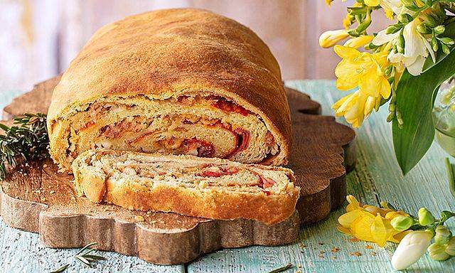 Estenda a outra porção de massa num rectângulo com a mesma dimensão e ponha-o sobre as carnes. Por cima, espalhe os restantes ingredientes e enrole como se fosse uma torta.