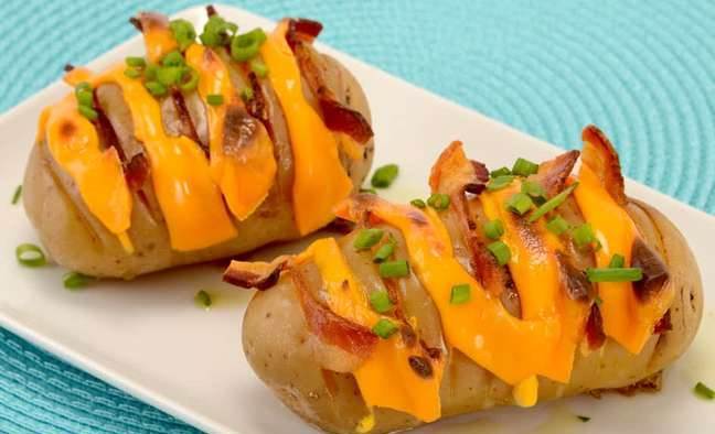 Com uma faca, corte fatias finas sem chegar até o final. Em cada batata, intercale entre as fatias as fatias de bacon.