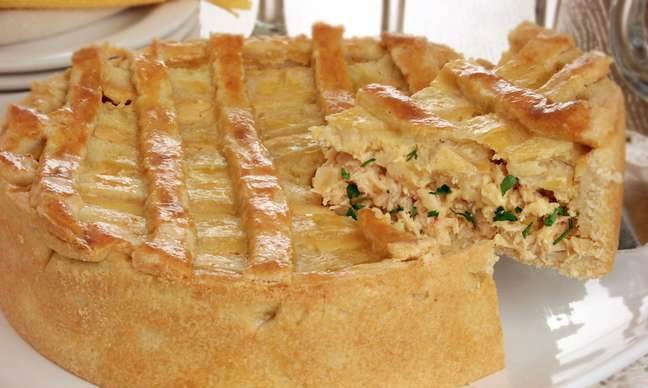 Forre o fundo e as laterais de uma fôrma de 24cm de diâmetro com parte da massa e espalhe o recheio.