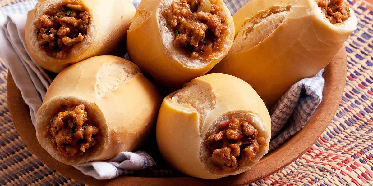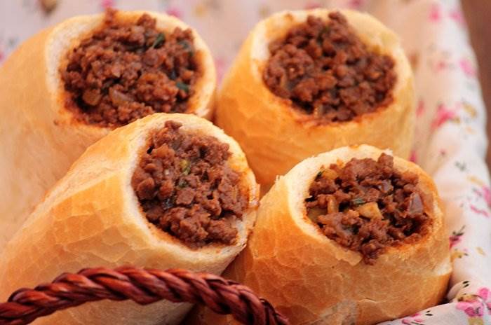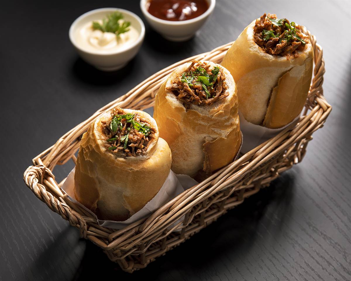 Sirva no pão francês, fazendo um buraco na extremidade e retirando o miolo com cuidado.