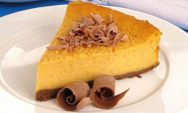 Bata no liquidificador o purê de abóbora, o suco, o creme de leite, os ovos, a canela, o açúcar, a manteiga, a maisena e a essência até obter um creme homogêneo.