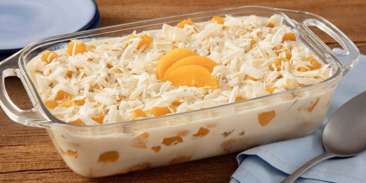 Repita a camada de biscoitos e coloque o restante do Creme e dos pêssegos.