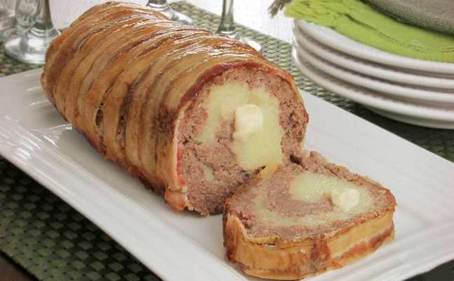 Coloque em uma fôrma e cubra com as fatias de bacon, uma ao lado da outra, cobrindo toda a carne.