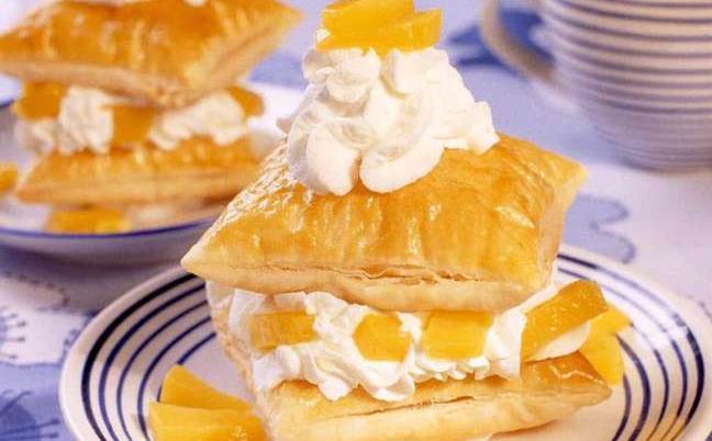 Coloque uma camada de massa, uma camada de chantilly, uma camada de pêssego e assim por diante até terminarem os ingredientes.