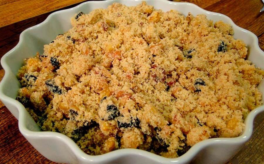 Acrescente o milho cortado das espigas, a água, a uva passa, as pimentas e o sal;