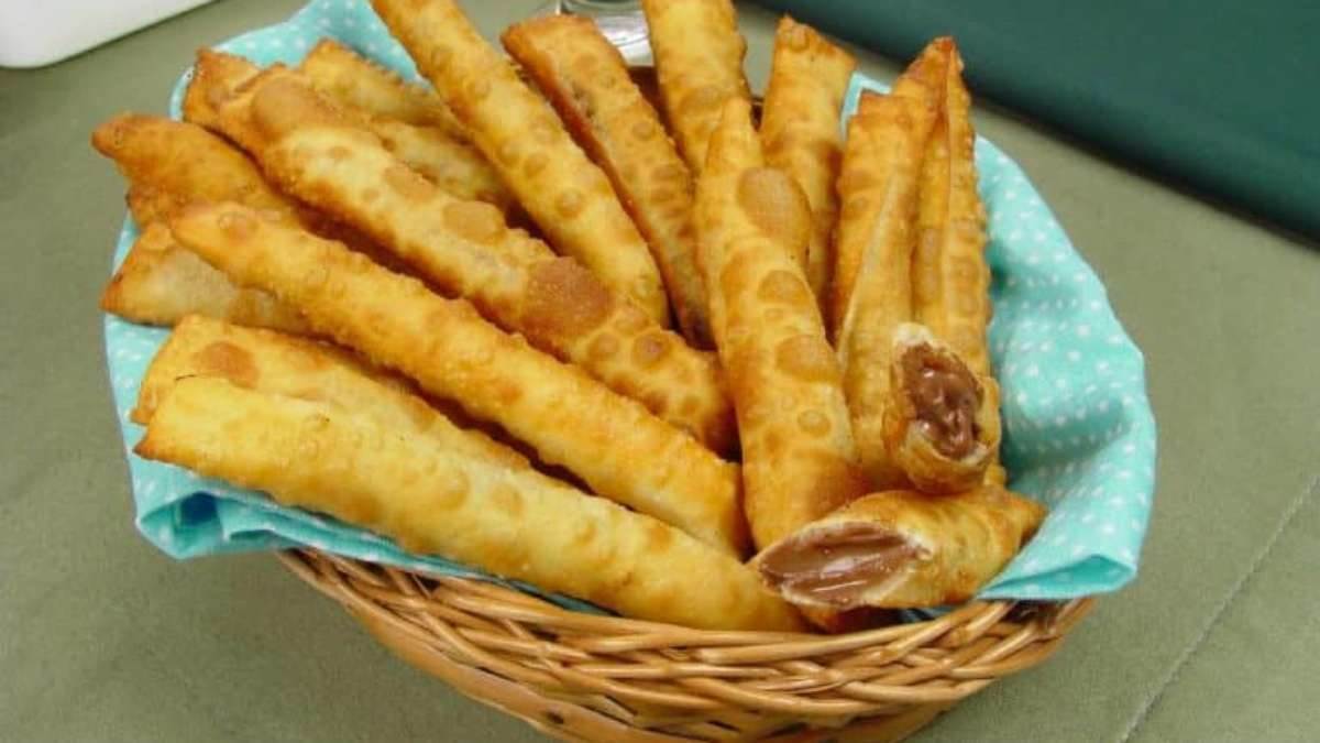 Corte a massa em retângulos, recheie com o creme de avelãs, aperte as bordas com um garfo para formar os canudos e frite, aos poucos, em óleo quente em imersão, até dourar.
